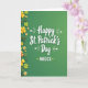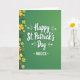 This card features a rich emerald-green background that fades into lighter jade, like a soft field of spring color. Centered across the middle, the words “Happy St. Patrick’s Day” appear in smooth white lettering that stands out clearly against the green. On either side of the main message, slim white arrows point inward, as if guiding two friends closer for a shared laugh. Beneath that, “NIECE” is set in all caps in white, with two small yellow arrows on each side adding a bright, affectionate nudge 💚. Along the left edge, a vertical border of stylized shamrocks stacks upward, each one shaded to look slightly raised. The clovers mix deep green, light lime, golden yellow, and soft peach-orange tones, giving the edge a lively spring accent ☘️. The overall layout keeps the text centered while the shamrock border adds a colorful frame on the left side.