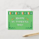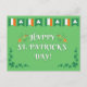 This green postcard features the Irish flag bunting banner at the top and a white "Happy St. Patrick's Day" text in the middle, decorated with confetti icons and shamrocks.