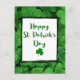 A postcard with a Happy St. Patrick's Day design written in a trendy green font. A green clover underneath the text. The background is a field of forest green clovers.