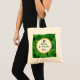 A tote bag which says Happy St. Patrick's Day with a background photo of a field with green clovers. A circular frame with a FAUX gold foil border holds the text which is written in a trendy font and contains a green clover illustration.