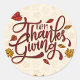 A round sticker with the words "Happy Thanksgiving" written in a stylised font, surrounded by autumn leaves. The background is a light beige colour with a subtle pattern of maple leaves. The words "Happy Thanksgiving" are written in a dark red colour with a thick, rounded font. The word "Happy" is written in a smaller font above the word "Thanksgiving". The leaves are in various shades of red, orange, and yellow. The sticker has a white border. The style is digital art.