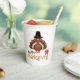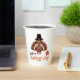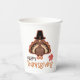 Celebrate Thanksgiving with these adorable pilgrim turkey paper cups that wish everyone a "Happy Thanksgiving" in a playful script under a colourful turkey wearing a black pilgrims hat.