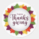 Happy Thanksgiving Day round sticker with a frame of colourful autumn leaves