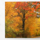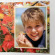 Thanksgiving greeting card with two photo holders and custom text.  Autumn foliage images are the background on both sides of cards that fold to the centre.  This gives the buyer a cover, and three panels inside to personalise.  Sample text on the front is “Happy Thanksgiving” with a place inside for more text.  Include a message and signature in red over off-white.  Each side panel has a photo template framed in off-white.  Red leaves are the background inside.  A fall scene covers the outside of the card.  The card could be used for any type of fall greeting to family and friends.