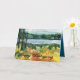 Happy Thanksgiving greetings featuring a vista from Mt. Tallac looking down on Fallen Leaf Lake in autumn with colourful leaves and a quiet peaceful lake with rolling hills covered in evergreens in the distance hand painted with watercolor. On the inside is a coordinating shade of blue with a single golden yellow leaf and text you can edit to fit your needs.