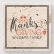 Elegant Happy Thanksgiving modern typography design in black and orange-red. Customisable family name. Simple black frame and acorn accents. Cool thanksgiving template.