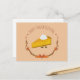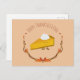 Postcard with a Thanksgiving design. A smiling piece of pumpkin pie that's topped with whipped cream is surrounded by a seasonal frame of autumn leaves and decorative branches. Above the design the words "Happy Thanksgiving" show. Those words can be customised as you like.