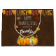 A large gift bag which says: Happy Thanksgiving a time to be thankful. A watercolor illustration of pumpkins, acorns, mushrooms and seasonal autumn leaves. A border along the top also composed of fall leaves, berries, acorns, and other foliage. Oak, maple and elm leaves falling down around the lettering. Dark brown background.