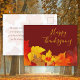 Happy Thanksgiving postcard with real leaves design. Red, orange and gold maple leaves make a bright border on dark red postcards with handwritten greeting in yellow. On the back, add your custom message with a signature, or delete that template. Bulk discounts apply.