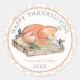 Celebrate Thanksgiving in delicious style with this festive round sticker featuring a watercolor turkey dinner illustration, soft autumn leaf border, and editable family name and year. Perfect for sealing envelopes, party favours, pie boxes, or cupcake toppers for your Thanksgiving gathering.