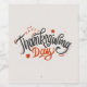 A digital art piece with the words "Happy Thanksgiving Day" in a decorative, calligraphic style. The word "Thanksgiving" is prominently displayed in a bold, black script with elegant swirls and flourishes, while "Day" is written in a complementary red script, also with a calligraphic touch. Above "Thanksgiving," the word "Happy" is written in a smaller, semi-circular arrangement with tiny red accents. The design includes small red maple leaves and star-like shapes scattered around the text, adding to the festive theme. The background is a soft, off-white colour with a subtle, grainy texture, giving the piece a vintage or rustic feel. The overall style is clean and modern, with a focus on typography and a limited colour palette.