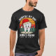 A whimsical design features a cheerful tooth wearing a Santa hat, surrounded by stylised Christmas trees. The vibrant backdrop of warm orange and green stripes evokes a festive feel, perfect for spreading holiday cheer.