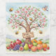 A festive, soft, and vibrant design celebrating the New Year for Trees. The illustration features a blossoming tree with delicate pink flowers, inhabited by small birds and smiling bees in a sweet, cartoonish style. At the base of the tree is an abundance of colorful traditional fruits and a wooden sign with the Hebrew inscription "ט"ו בשבט שמח" (Happy Tu B'Shevat). The watercolor style lends an artistic and pleasant feel, suitable for party supplies, personalized gifts, educational materials, and festive home decor.