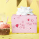 Happy Valentine’s Day text with hearts and pink background.