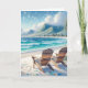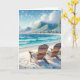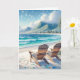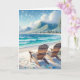 Romantic Valentine's Day card. Text inside can be personalised. Gorgeous ai watercolor illustration of blue ocean waves crashing on a sandy beach with a background of mountains and dunes. A heart drawn in the sand next to pretty sea glass.
