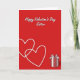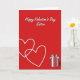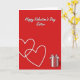 This greeting card uses a deep red background that instantly feels like Valentine’s Day. At the top, the words “Happy Valentine’s Day Sister” appear in white cursive-style lettering, like a smooth handwritten note, centered near the upper edge. On the left side, two thin white heart outlines overlap slightly, suggesting closeness and a shared bond. In the lower-right corner, there’s a gift box with red-and-white vertical stripes and a full bow on top in matching colors. A faint shadow under the box helps it feel grounded on the page. The simple red-and-white palette keeps the focus on love, appreciation, and the special connection you have with your sister 🥰. It’s a meaningful card to give when you want to say “I’m thinking of you” in a direct, caring way ❤️.