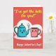 This Valentine’s Day card shows a teal teapot and a pink mug drawn like cute little characters, sitting together on a soft, white cloud shape. The teapot has a wide open smile and rosy cheeks, and black steam curls up from its spout as it leans toward the mug. The mug looks shy and sweet with a blush on its face, as if it’s flattered by the attention. The background is a flat, bright red that makes the teal and pink colors stand out clearly. At the top, the card says “I’ve got the hots for you!” in sunny yellow block letters, like a fun headline above the pair. Near the bottom, “Happy Valentine’s Day!” appears in rounded white letters that are easy to read and feel friendly. Altogether, it’s a simple, warm design that mixes a silly pun with real affection ❤️💌🍫. Hope it helps you share kind Valentine’s Day feelings with someone you care about.