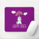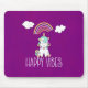 A mousepad with a cute illustration of a white unicorn sitting on its rump smiling and looking happy. Smiling clouds and a rainbow overhead. Text says: Happy Vibes. Adorable uplifting image. Set on a pinkish purple watercolor background.