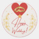 Happy wedding sticker decorated by two golden rings, golden stars and yellow flowers