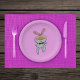 This paper plate is pretty pink with a happy white bunny rabbit giving a thumbs up sign wearing a black bow tie with pink ears and cheeks.