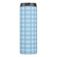 This thermal tumbler bottle to keep your drinks cold or hot is a blue and white plaid with a happy white mother cat wearing a pink polka dotted bow sitting with her three kittens all wearing pink bows. Customise the text with the template.