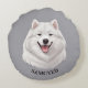This round pillow features an AI image of happy white samoyed dog on grey background. Personalise it with name or photo of your pet.