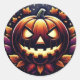 This sticker features a glowing, carved Halloween pumpkin with menacing eyes and a wide grin, surrounded by autumn leaves under a starry night sky, symbolising spooky fall vibes.