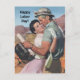 Vintage retro style image of a man in his hard hat, work clothes, lunch pail in hand getting a big hug on this postcard.. perfect for wishing family & friends a "Happy Labour Day".. ready-to-order as displayed or make some changes!