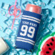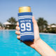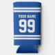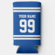 Hard seltzer can coolers with sports jersey number. Athletic stripe design with custom name. Blue or custom colour. Cool gifts and party accessories for sports fans, football players, coach etc. Double sided print. Personalise with your text.