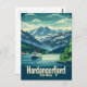 A breathtaking and nostalgic depiction of Hardangerfjord, Norway's second-longest fjord, celebrated for its dramatic landscapes and natural beauty. The design captures the fjord's majestic cliffs towering over deep blue waters, adorned with cascading waterfalls and lush green orchards during spring bloom. Rendered in a vintage style, the artwork evokes the serene atmosphere and awe-inspiring vistas of Hardangerfjord, inviting viewers to explore its pristine wilderness and scenic charm.