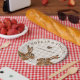 Personalizable wedding paper plates featuring a beige gingham background with two brown watercolor hare heads facing each other. The design includes space at the top for the couple’s names along with a separate personalizable area for the wedding date accented by a brown heart silhouette. A lovely choice for rustic, countryside, woodland or spring wedding or engagement celebrations.