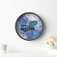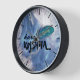 The size of the clock is dramatic and the abstract alcohol ink design is soothing and intricate at the same time. I chose the black frame that adds pop to the blue and gold design. The gold printing would be better in a slightly darker or larger font. I love it and I’m looking for just the right place in ny new apartment. I would recommend this clock for a personal gift or a present. I feel that the quality is excellent for the money! I’m a bit of a clock nut so I’m pretty particular about my purchases. The clock is larger in diameter than many if the clocks I have, so it stands out very well. I think a slightly darker printing color and a moderately larger size would best suit a professional decor or add more impact in a work place item.