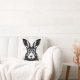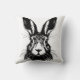 This throw pillow features a black line art illustration of a creepy hare staring at the viewer.