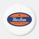 Oval signage design featuring the neighbourhoods of New York City. Official orange and blue colours of NYC. Harlem neighbourhood of Manhattan.