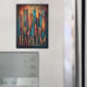 The design showcases a stylised cityscape rich with art deco architecture, geometric lines, and deep, moody tones. At the heart of the image, silhouetted figures evoke the energy of 1920s Harlem — musicians, dancers, and artists in motion — celebrating a golden age of jazz and cultural expression. The palette blends warm golds, midnight blues, and rich burgundies, creating an elegant and dramatic contrast perfect for a compact format.
