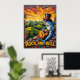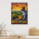 This imaginative painting portrays a shark, adorned with a top hat and cool sunglasses, unleashing a "sunset symphony" on an electric guitar from a rocky summit. The scene unfolds over rolling green hills and trees, bathed in the warm, textured light of a setting sun. The vibrant, impasto brushwork creates a powerful and whimsical atmosphere, celebrating the "ROCK and ROLL" spirit in a unique natural setting.