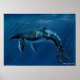Harmonious Humpback Whale print by wildlife artist Michaeline McDonald features a humpback whale under the water with sunbeams and sparkles shining through and reflecting on the whale. Deep blue colors.