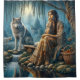 In a serene woodland setting, a Native Indian woman sits thoughtfully by a gently flowing stream, accompanied by a majestic wolf