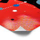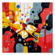 This abstract artwork plays with a vibrant palette of red, yellow, black, white and blue. Organic and geometrical shapes blend together, while lines and dots create a sense of motion and rhythm. The central motive, consisting of dynamically crossed shapes, appears to be floating in a universe of color surfaces and patterns. The composition calls for a sense of energy and harmony, in which order and spontaneity meet.