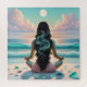Beautiful ai art depicting a gorgeous woman meditating on the beach with pina and blue clouds, ocean waves, white sand and sea glass.