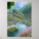 This digital artwork depicts a serene and idyllic stream meandering through a stunning landscape teeming with vibrant colours and natural beauty. The stream is lined with lush green grass and trees, and a colourful array of flowers adorns its banks, adding to the picturesque scenery. In the distance, majestic mountains rise up, creating a breathtaking backdrop for the scene. The overall effect is one of peace and tranquillity, inviting the viewer to immerse themselves in the beauty of nature.