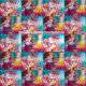Colourful,artistic whimsical,abstract figurative contemporary watercolor painting with three player figures,floral swirls,roses,flowers,gold sparkles,silver foil in vibrant yellow,red green,blue,pink fuchsia colours .