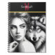 A captivating black and white painting depicting a woman in deep connection with a majestic wolf, showcasing a bond between two powerful beings.