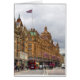 Harrods Department Store in Knightsbridge flying the Union Jack flag for Britain. The Harrods motto is Omnia Omnibus Ubique All Things for All People, Everywhere. Several of its departments, including the seasonal Christmas department and the Food Hall, are world famous. Now owned by Qatar Holding after been sold by Mohamed Al Fayed. Opened in 1849.