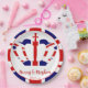 NewParkLane - Royal Wedding paper plates to celebrate the Royal Wedding between Prince Harry and Meghan Markle on May 19th, 2018, with the Royal Crown coloured with a British Flag - the Union Jack - and ' Harry & Meghan' in elegant script typography. Around the edges a british flag pattern.