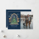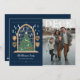 Send enchanting holiday wishes with this magical Harry Potter-themed Christmas card! One side of the card features a beautiful illustration of a Hogwarts-inspired stained-glass window, showcasing a decorated Christmas tree adorned with moons, stars, and wands. Floating candles and the crests of the four houses (Gryffindor, Hufflepuff, Ravenclaw, Slytherin) flank the window, all against a deep navy blue background. Below this festive scene, customizable text allows for the family name and individual names in an elegant script. The other side of the card is dedicated to a cherished horizontal family photo, capturing a joyful winter moment, overlaid with "DECK THE HALLS" in classic white lettering. This card perfectly blends the warmth of family holiday traditions with the enchanting world of Hogwarts!