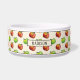 Destei's pattern of red and green cartoon apple fruits on a very light beige background colour. There is also a personalizable text area for a name or other custom text such as "water" or "dinner", for example. The top and bottom have thin black borders framing the design. This design is ideal for the fall time or for pet's that have an Autumn theme name such as "Apple" or "October".