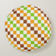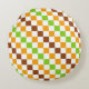 A vibrant chequered pattern of alternating green, orange, and brown squares on a white background. The design creates a lively, geometric feel.