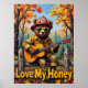 This heartwarming artwork captures a bear dressed in firefighter gear, including a helmet and sunglasses, playing an acoustic guitar while comfortably seated on a wooden fence amidst a colourful autumn setting. Fallen leaves decorate the ground, and the trees overhead are ablaze with fall colours. A jar of honey with a dipper rests nearby. The painting's thick, textured strokes add to the endearing quality of the image, with the words "Love My Honey" featured below.
