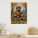 This heartwarming artwork captures a bear dressed in firefighter gear, including a helmet and sunglasses, playing an acoustic guitar while comfortably seated on a wooden fence amidst a colourful autumn setting. Fallen leaves decorate the ground, and the trees overhead are ablaze with fall colours. The painting's thick, textured strokes add to the endearing quality of the image, with the words "Love My Honey" featured below